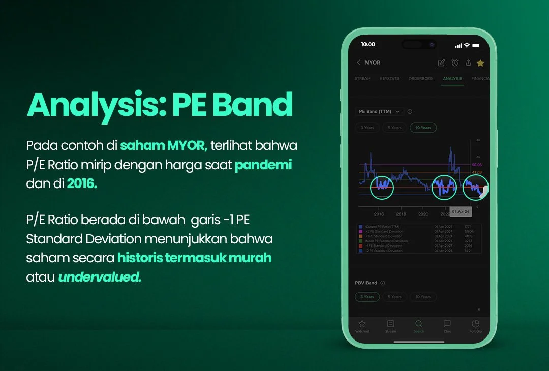 Valuasi berdasarkan PE Band: untuk menentukan harga wajar saham berdasarkan historical Price to Earnings Ratio (ada 2 pilihan: PE Band TTM dan Forward PE Band)