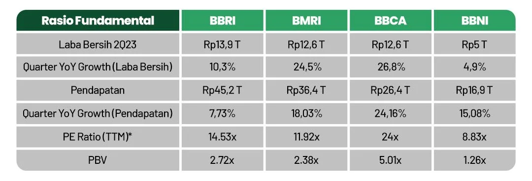 Berdasarkan data di atas dapat dilihat bahwa dari Big 4 banks, BMRI dan BBCA memiliki pertumbuhan laba bersih paling unggul di 2Q23 sebesar Rp 12,6 Triliun (BMRI 24,5% YoY dan BBCA 26,8% YoY).