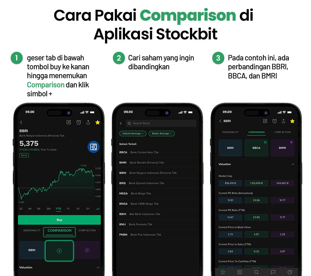 Kamu juga bisa membandingkan data dengan emiten lain yang sedang kamu analisis dengan fitur Comparison. Caranya sebagai berikut