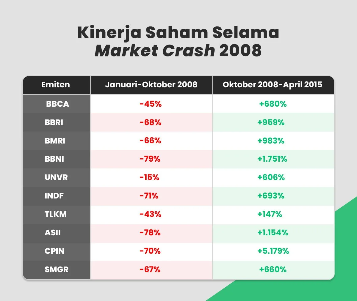Beberapa saham tak melemah sedalam IHSG selama market crash 2008, seperti BBCA (-45%), TLKM (-43%), dan UNVR (-15%). Bahkan saat IHSG rebound dan naik +407% dari Oktober 2008 sampai April 2015, banyak saham yang melaju lebih kencang dibandingkan IHSG, seperti BBCA (+680%), ASII (+1.154%), dan BBNI (+1.751%). Saham-saham big caps dengan fundamental yang baik biasanya akan diapresiasi oleh market dengan kenaikan yang lebih kencang dibandingkan IHSG.