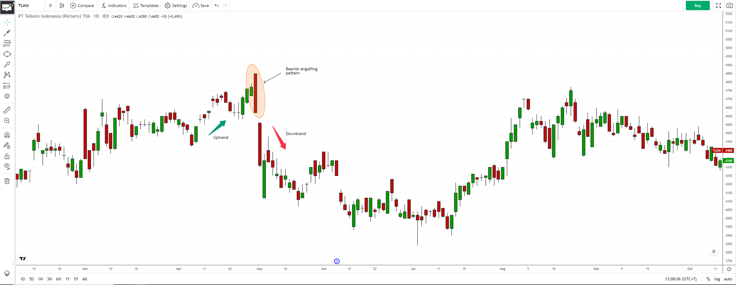 Berikut adalah contoh pola bearish engulfing yang terbentuk pada grafik saham TLKM. Seperti yang terlihat pada grafik di bawah, sebelum pola terbentuk saham terlebih dulu berada dalam tren naik atau bullish.