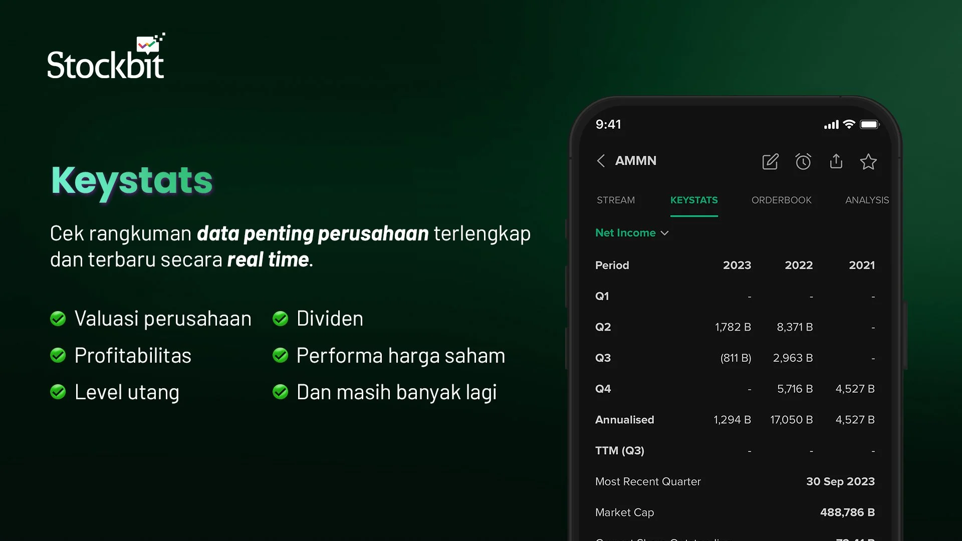 Selain bisa trading saham online, di Stockbit juga tersedia berbagai fitur yang dapat memudahkan kamu dalam investasi saham. Salah satunya adalah fitur Keystats. Melalui fitur ini, kamu bisa cek ringkasan data keuangan penting suatu emiten secara lengkap dan real-time.