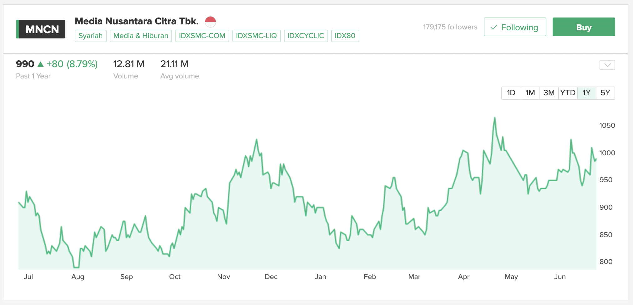 Per 24 Juni 2022, harga saham MNCN berada pada posisi Rp 990. Saham yang bergerak di bidang media ini memang berfluktuatif sepanjang waktu. Harga tertinggi selama kurun 5 waktu terakhir berada pada Januari 2020 di harga Rp 1750 / lembar.