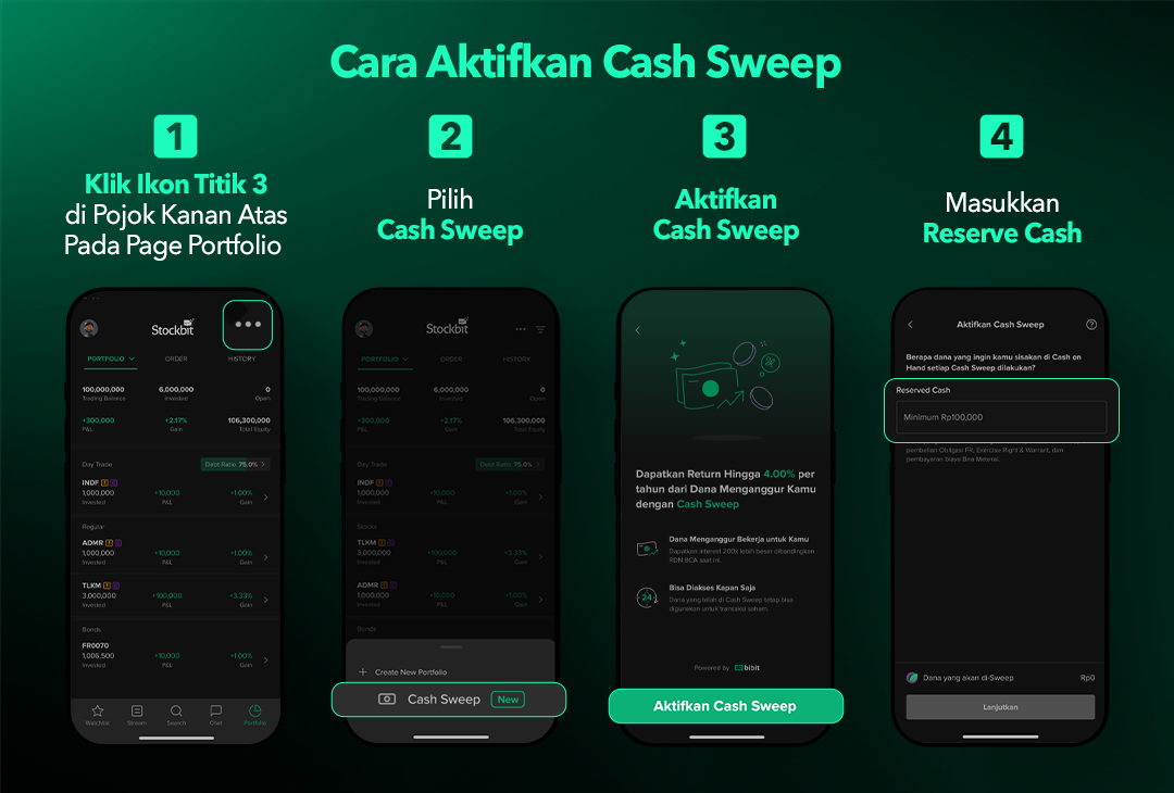 Cash Sweep adalah fitur Stockbit yang disupport Bibit untuk investasikan dana menganggur kamu di RDN ke Reksa Dana Pasar Uang dari Grow Optima Liquid Fund dengan potensi imbal hasil hingga 4,00% per tahun.