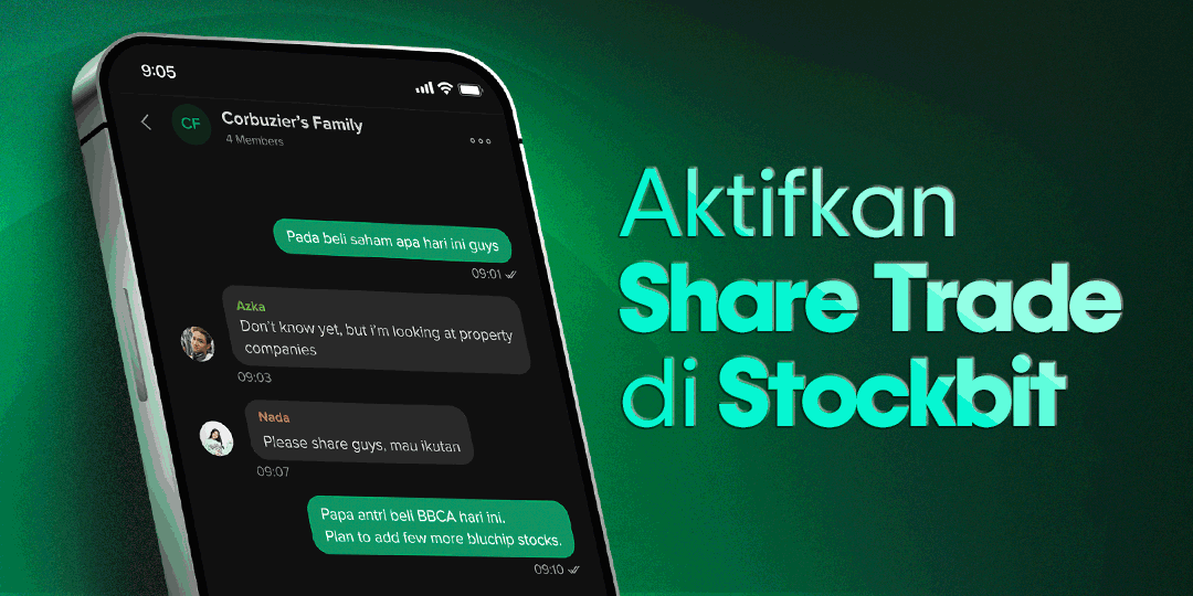 Dengan Share Trade, kamu bisa saling membagikan aktivitas trading secara otomatis kepada teman dan keluarga lewat fitur Chat di Stockbit.