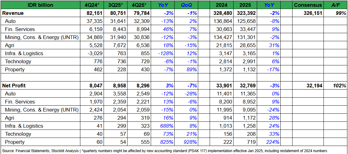 Astra International ($ASII) mencatatkan laba bersih sebesar Rp8,3 T pada 4Q25 (+3% YoY, -7% QoQ). Hasil ini membuat laba bersih selama 2025 mencapai Rp32,8 T (-3% YoY), sejalan dengan ekspektasi (102% estimasi konsensus). Di antara ketiga bisnis inti perseroan, segmen āfinancial servicesā menjadi penopang kinerja pada 2025, sementara segmen 'heavy equipment, mining, construction & energy (HEMCE)ā di bawah anak usaha United Tractors ($UNTR) menjadi pemberat kinerja.