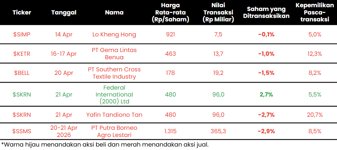 - $LOPI: Logisticsplus International berencana menggelar private placement hingga ~110 juta saham baru dengan efek dilusi hingga 3,43%. Harga pelaksanaan dan calon investor belum diumumkan, sementara perolehan dana ditujukan untuk pengembangan usaha dalam bentuk modal kerja, penambahan outlet, serta pembelian saham dan/atau aset pada perusahaan di industri terkait. Rencana ini akan dibahas dalam RUPSLB pada 2 Juni 2026.