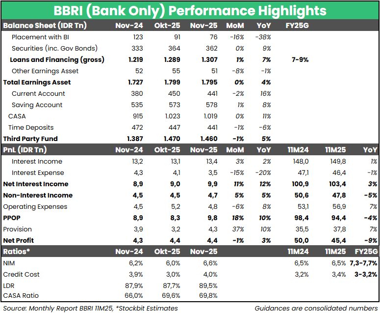 Bank Rakyat Indonesia ($BBRI) mencatatkan laba bersih bank only sebesar Rp4,4 T pada November 2025 (+3% YoY, -1% MoM). Hasil ini membuat laba bersih bank only selama 11M25 mencapai Rp45,4 T (-9% YoY), setara 81% estimasi 2025F konsolidasi konsensus (vs. 11M24: 83% realisasi konsolidasi 2024). Kinerja dalam 2 bulan terakhir (OktoberāNovember 2025) menunjukkan perbaikan dari sisi Net Interest Income (NII) seiring penurunan beban pendanaan, tetapi terkompensasi opex yang kembali meningkat dan beban provisi yang masih tinggi.