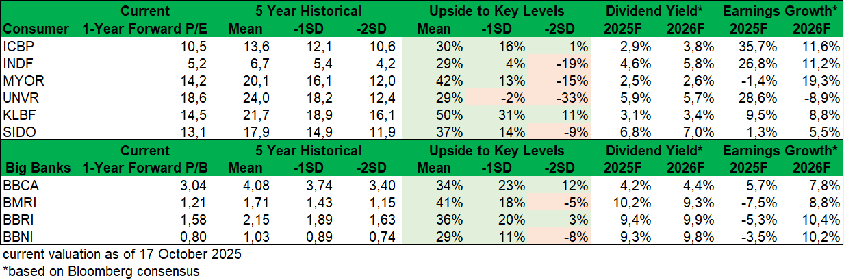 Secara fundamental, sektor consumer memiliki prospek pertumbuhan laba bersih yang relatif lebih baik pada 2025ā2026F dibandingkan big banks, dengan $ICBP + $INDF dan $KLBF paling menonjol dari aspek ini. Sementara itu, big banks ā kecuali $BBCA ā berpotensi mengalami penurunan laba pada 2025F sebelum pulih pada 2026F, tetapi hal ini dikompensasikan dengan prospek dividen (dividend yield) yang relatif lebih tinggi dibandingkan sektor consumer. Dalam jangka pendek, kami memperkirakan rilis kinerja 3Q25 secara umum berpotensi menjadi yang terendah (bottom) dan akan mulai pulih pada 4Q25.