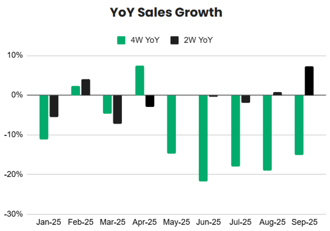 Berdasarkan merek, Astra International ($ASII) mencatatkan kinerja penjualan yang relatif lebih baik dibandingkan keseluruhan kompetitor. Pada September 2025, ASII mencatatkan penurunan wholesales sebesar -16% YoY, tetapi secara bulanan naik +10% MoM. Sebagai perbandingan, total wholesales nonāASII turun -14% YoY dan -9% MoM.