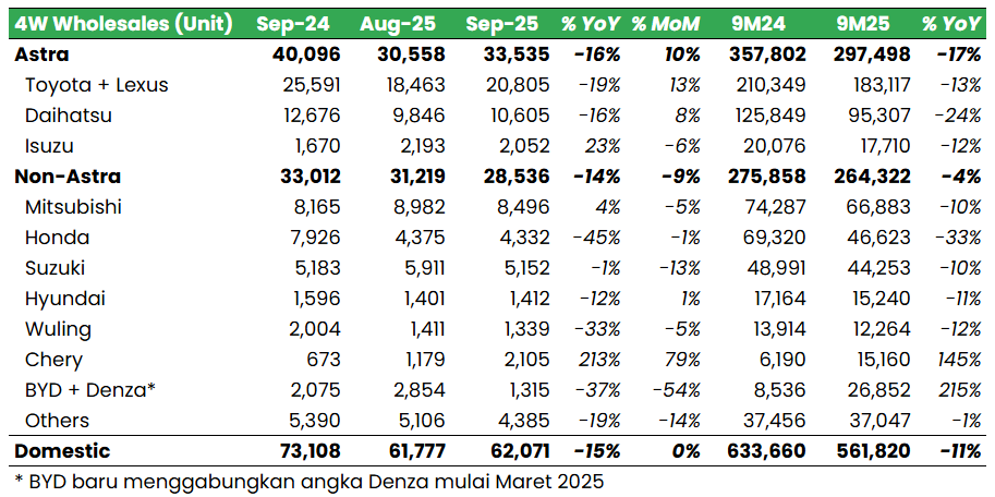 Dari sisi kompetitor ASII, kami menyoroti wholesales BYD+Denza yang hanya mencapai 1.315 unit pada September 2025 (-37% YoY, -54% MoM), yang menandai wholesales bulanan di bawah 2.000 unit pertama sejak Januari 2025.