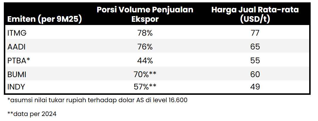 Penerapan bea keluar untuk komoditas batu bara berpotensi untuk menekan laba bersih emiten batu bara, dengan dampak yang lebih besar bagi perusahaan dengan porsi penjualan ekspor dan batu bara berkalori tinggi yang besar. Berdasarkan estimasi kami, kebijakan tersebut berpotensi menekan laba bersih emiten batu bara sebesar -7% hingga -27% untuk tahun 2026, dengan asumsi ceteris paribus atas variabel porsi ekspor dan blended ASP berdasarkan kinerja annualized 9M25 yang dimiliki masing–masing perseroan saat ini. Sebagai konteks, estimasi penurunan -7% didapat pada skenario tarif terkecil (1%) dengan persentase ekspor terkecil (PTBA), sementara estimasi penurunan hingga -27% didapat pada skenario tarif terbesar (5%) dengan persentase ekspor terbesar (ITMG). Namun, estimasi tersebut dapat berubah tergantung dari rincian peraturan yang akan dirilis serta porsi ekspor dan blended ASP masing–masing perseroan di masa depan.
