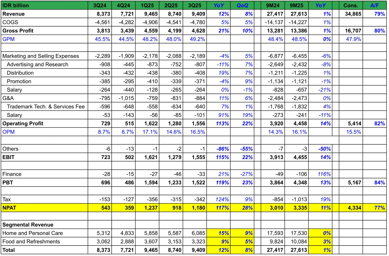 Seperti yang kami tuliskan sebelumnya, UNVR telah menunjukkan progres pembenahan pada sisi biaya (costs) pada 1Q25ā2Q25 dan tantangan selanjutnya adalah memperlihatkan hasil pembenahan pada sisi pendapatan (revenue). Pada 3Q25, UNVR mencatatkan pertumbuhan pendapatan sebesar +12% YoY, menandai pertumbuhan secara tahunan yang pertama sejak 3Q23. Meski level pertumbuhan secara tahunan turut disebabkan oleh lowābase effect pada 3Q24, level pendapatan secara kuartalan juga masih naik +8% QoQ dan berada pada level yang relatif sama dengan 1Q25, periode di mana pendapatan terdorong efek Lebaran.