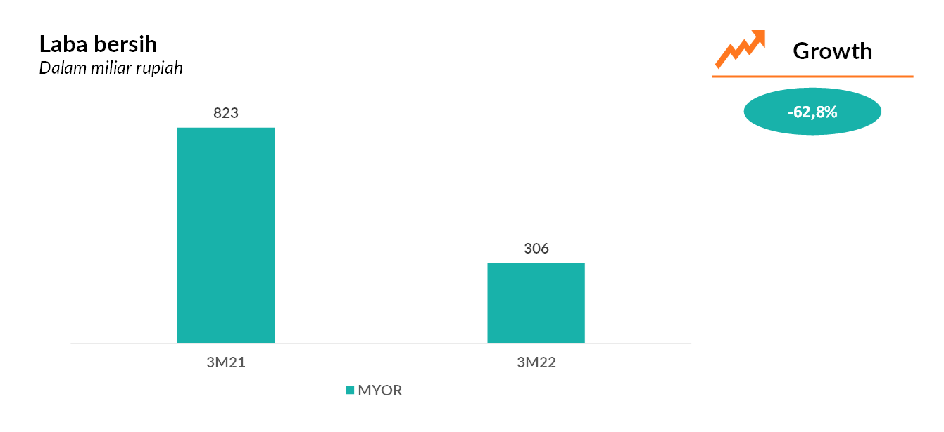 $MYOR: Laba bersih Mayora Indah anjlok -62,8% YoY menjadi 306 miliar rupiah pada 1Q22. Penjualan tumbuh moderat +3,4% menjadi 7,6 triliun rupiah, didorong penjualan segmen makanan (+12,0%), sedangkan segmen minuman mengalami penurunan (-6,6%).