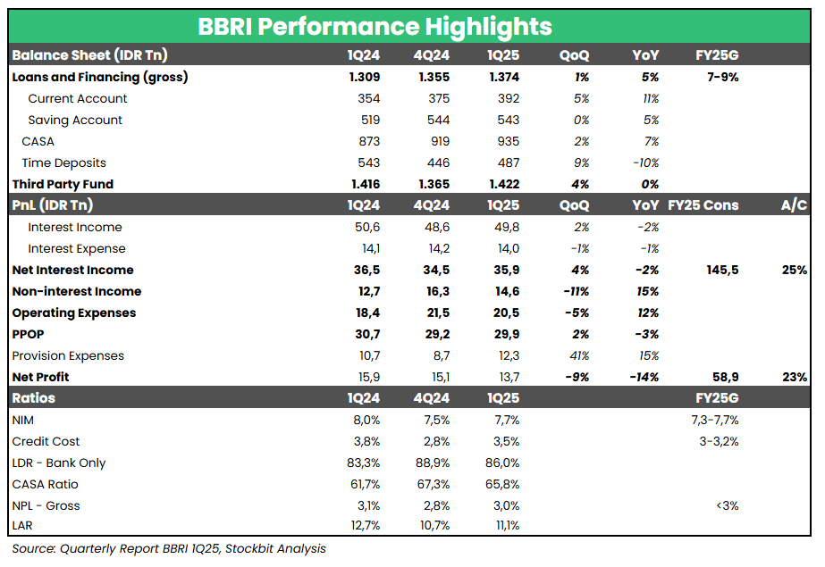 Bank Rakyat Indonesia ($BBRI) mencatatkan laba bersih sebesar 13,7 triliun rupiah pada 1Q25 (-14% YoY, -9,4% QoQ), relatif sejalan dengan ekspektasi (23% estimasi 2025F konsensus). Penurunan laba bersih secara tahunan utamanya disebabkan oleh lonjakan beban provisi menjadi 12,3 triliun rupiah (+15% YoY, +41% QoQ). Net Interest Income (NII) dan Pre–provision Operating Profit (PPOP) relatif flat pada 1Q25, masing–masing turun -2% YoY dan -3% YoY.