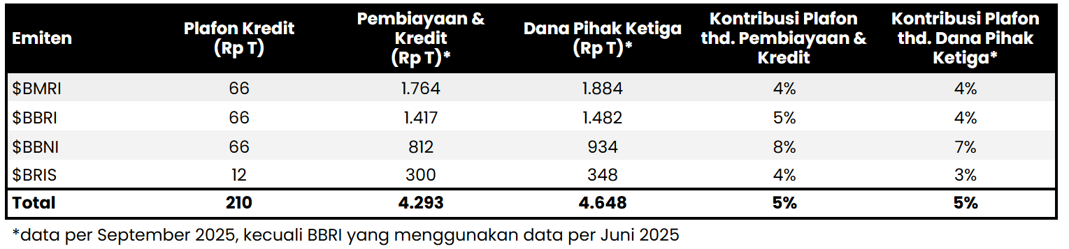 Wakil Menteri Koperasi, Farida Farichah, mengatakan bahwa Danantara telah sepakat untuk menyediakan plafon kredit sebesar 210 triliun rupiah untuk pengembangan ~80.000 unit Koperasi Desa Merah Putih (KDMP). Farida menjelaskan bahwa Bank Negara Indonesia ($BBNI), Bank Mandiri ($BMRI), dan Bank Rakyat Indonesia ($BBRI) masing–masing akan mengelola 66 triliun rupiah, sementara 12 triliun rupiah sisanya akan ditempatkan di Bank Syariah Indonesia ($BRIS). Lihat tabel di atas untuk mengetahui perbandingan plafon tersebut terhadap posisi kredit dan dana pihak ketiga dari himpunan bank milik negara (Himbara) saat ini.