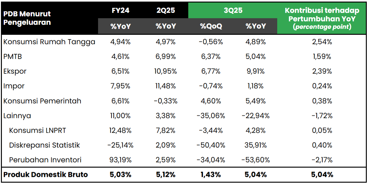 Pertumbuhan ekonomi yang lebih lambat pada 3Q25 juga dikontribusikan oleh pertumbuhan pembentukan modal tetap bruto (PMTB) yang melandai ke +5,04% YoY (vs. 2Q25: +6,99%) seiring ketegangan geopolitik dan perdagangan global.