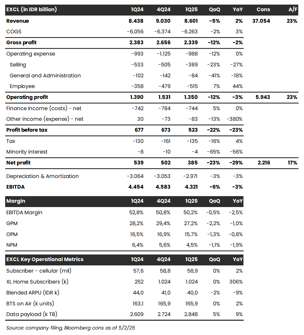 XLSmart Telecom Sejahtera ($EXCL) telah mengumumkan kinerja keuangan pada 1Q25 – yang merupakan kinerja XL Axiata sebelum merger dengan Smartfren Telecom – dengan laba bersih sebesar 385 miliar rupiah (-29% YoY, -23% QoQ). Hasil ini di bawah ekspektasi (17% dari estimasi 2025F konsensus).