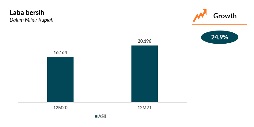 Alhasil, secara kumulatif selama tahun 2021 (12M21), laba bersih perusahaan naik 24,9% menjadi 20,2 triliun rupiah. Kenaikan ini didukung oleh meningkatnya pendapatan sebesar 33,4% menjadi 233,5 triliun rupiah. (ASII)