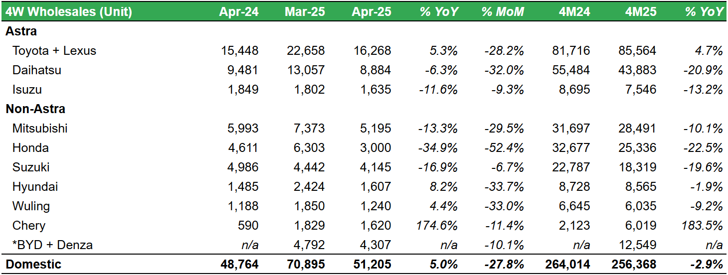 Gaikindo mencatat bahwa penjualan wholesales mobil nasional pada April 2025 mencapai 51.205 unit (+5% YoY, -28% MoM). Hasil ini membuat realisasi penjualan wholesales selama 4M25 menjadi 256.368 unit (-3% YoY), relatif sejalan dengan ekspektasi karena setara 28โ€“34% target 2025 dari Gaikindo di kisaran 750.000โ€“900.000 unit (vs. 4M24: 30% dari realisasi 2024).