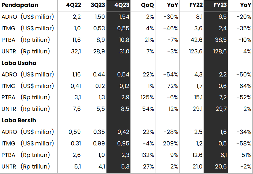 Tahun 2023 menjadi tahun yang cukup menantang bagi emiten produsen batu bara seiring normalisasi harga batu bara, setelah sempat melonjak pada 2022 akibat konflik Rusia–Ukraina. Hal ini terefleksi dalam laporan keuangan 2023, di mana emiten batu bara kompak mengalami penurunan laba bersih.
