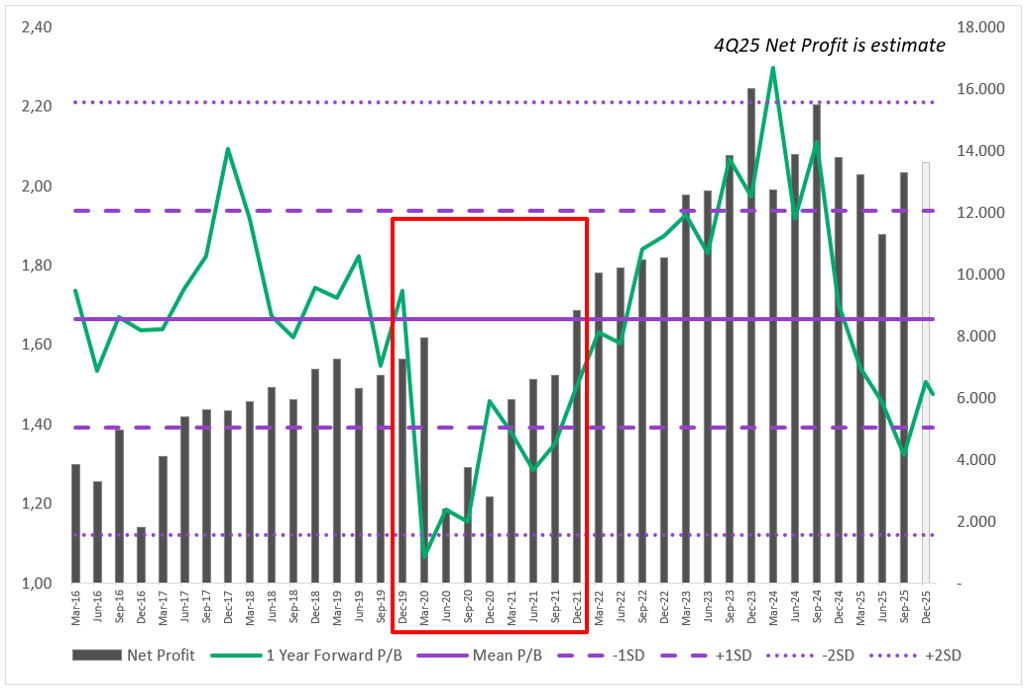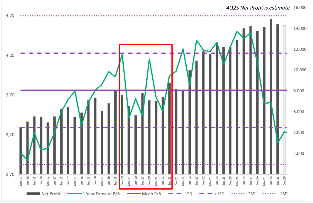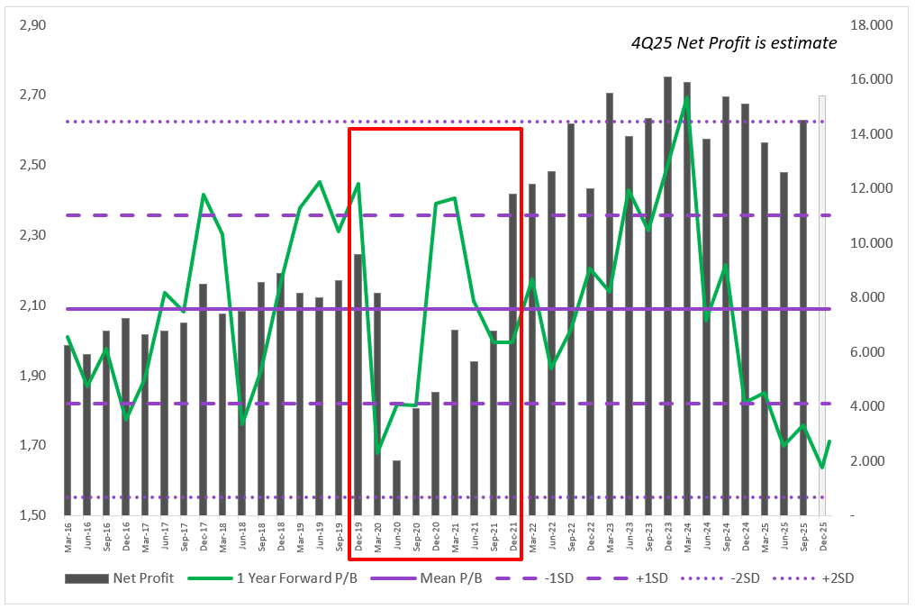 Valuasi Big 4 Banks saat ini tergolong rendah secara historis, yakni di kisaran 0,5 hingga 1,5 standar deviasi di bawah mean per 15 Januari 2026. Namun, kami menilai investor juga perlu melihat valuasi tersebut dalam konteks momentum laba bersih karena level valuasi memiliki korelasi positif dengan momentum laba bersih secara historis. Sebagai ilustrasi, ketika laba bersih anjlok pada 2020 akibat pandemi Covid–19, valuasi pun turun dan baru pulih seiring pemulihan kinerja mulai 2021 dan berlanjut hingga 2023.