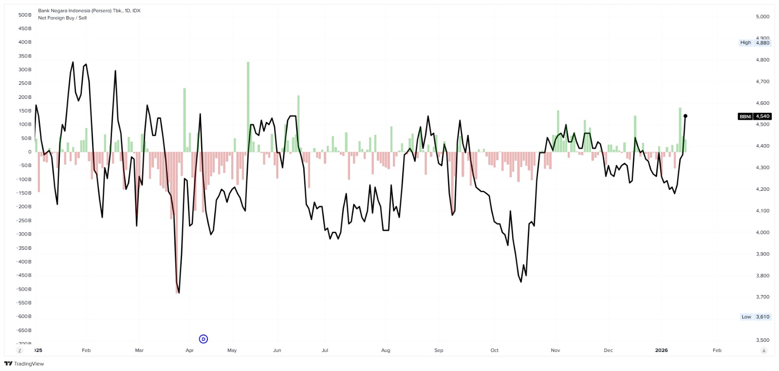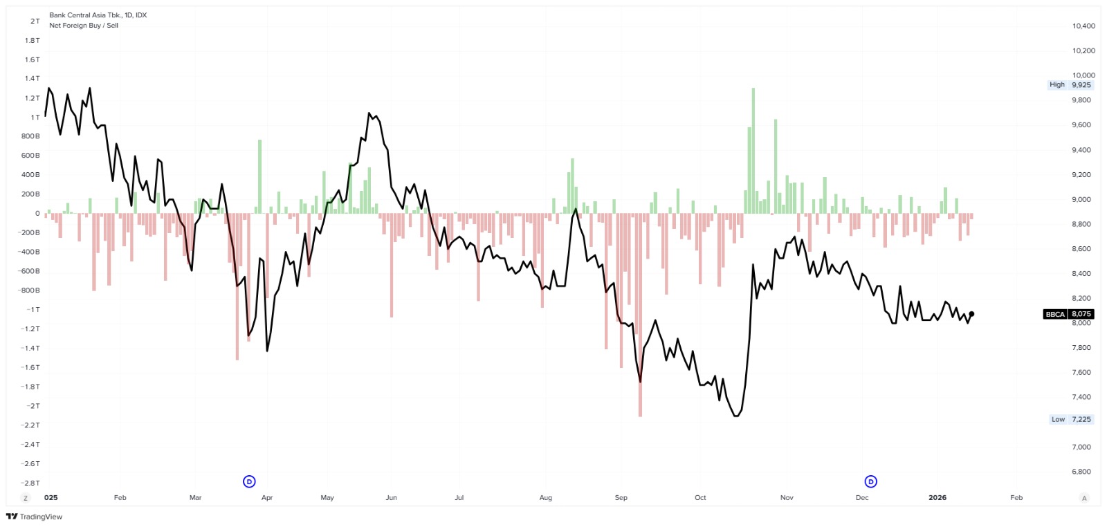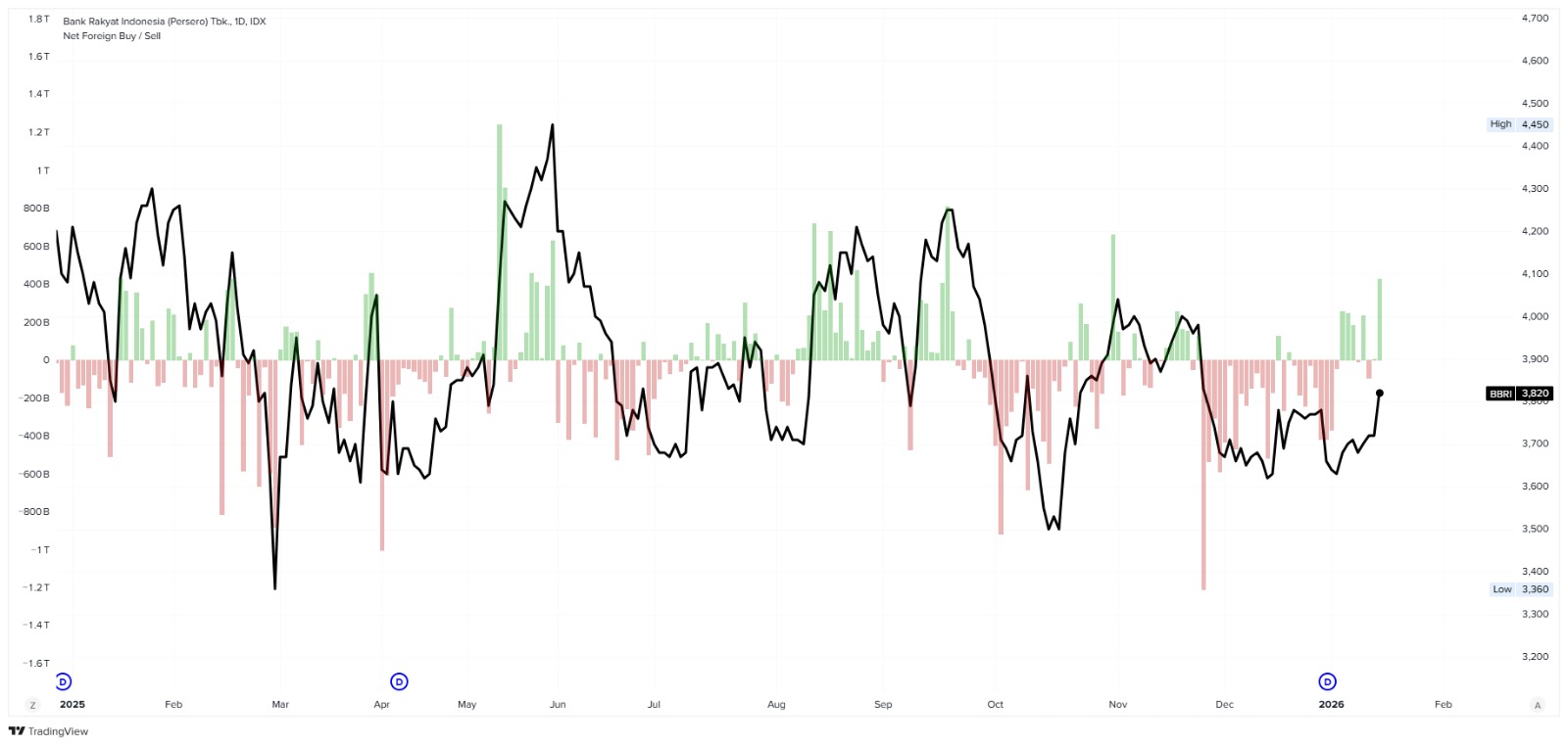 Sepanjang 2025, Big 4 Banks mengalami tekanan jual masif dari investor asing. Tekanan jual ini tidak hanya didorong oleh pelemahan kinerja emiten, tapi juga karena berbagai ketidakpastian kebijakan pemerintah seperti pembentukan Danantara, isu independensi Bank Indonesia, dinamika pergantian menteri keuangan dan kaitannya dengan concern kedisiplinan fiskal, hingga concern penugasan Himbara dalam program-program pemerintah. Isu–isu ini menimbulkan sentimen ‘risk–off’ bagi Big 4 Banks.