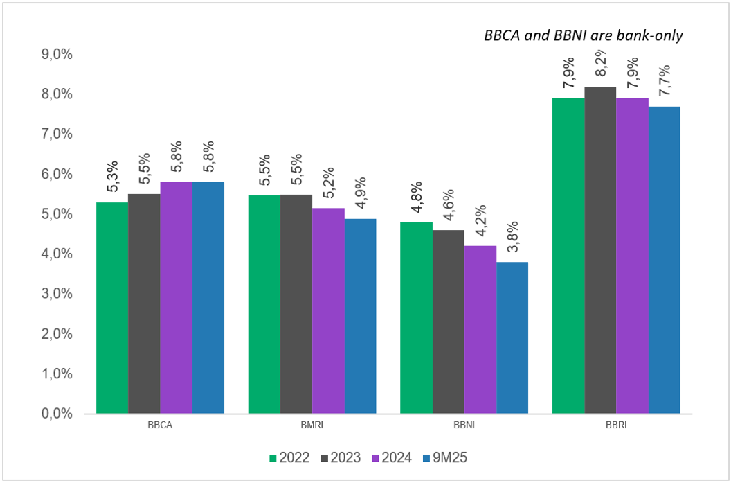 Pertumbuhan kredit yang kencang pada 2023–2024 (rata–rata Big 4 Banks: +13% YoY per tahun) menyerap banyak DPK di tengah kebijakan GWM yang sudah dinormalisasi pada akhir 2022 dan siklus peningkatan suku bunga BI (+275 bps) dari Agustus 2022–April 2024. Dinamika ini menyebabkan likuiditas mulai mengetat pada 2H24 dan mendorong meningkatnya kompetisi pada DPK, sehingga berujung pada kenaikan CoF dan tekanan pada NIM hingga 9M25. Dinamika ini tidak begitu memengaruhi BBCA karena franchise funding yang kuat dan likuiditas yang ample, sehingga NIM relatif terproteksi.