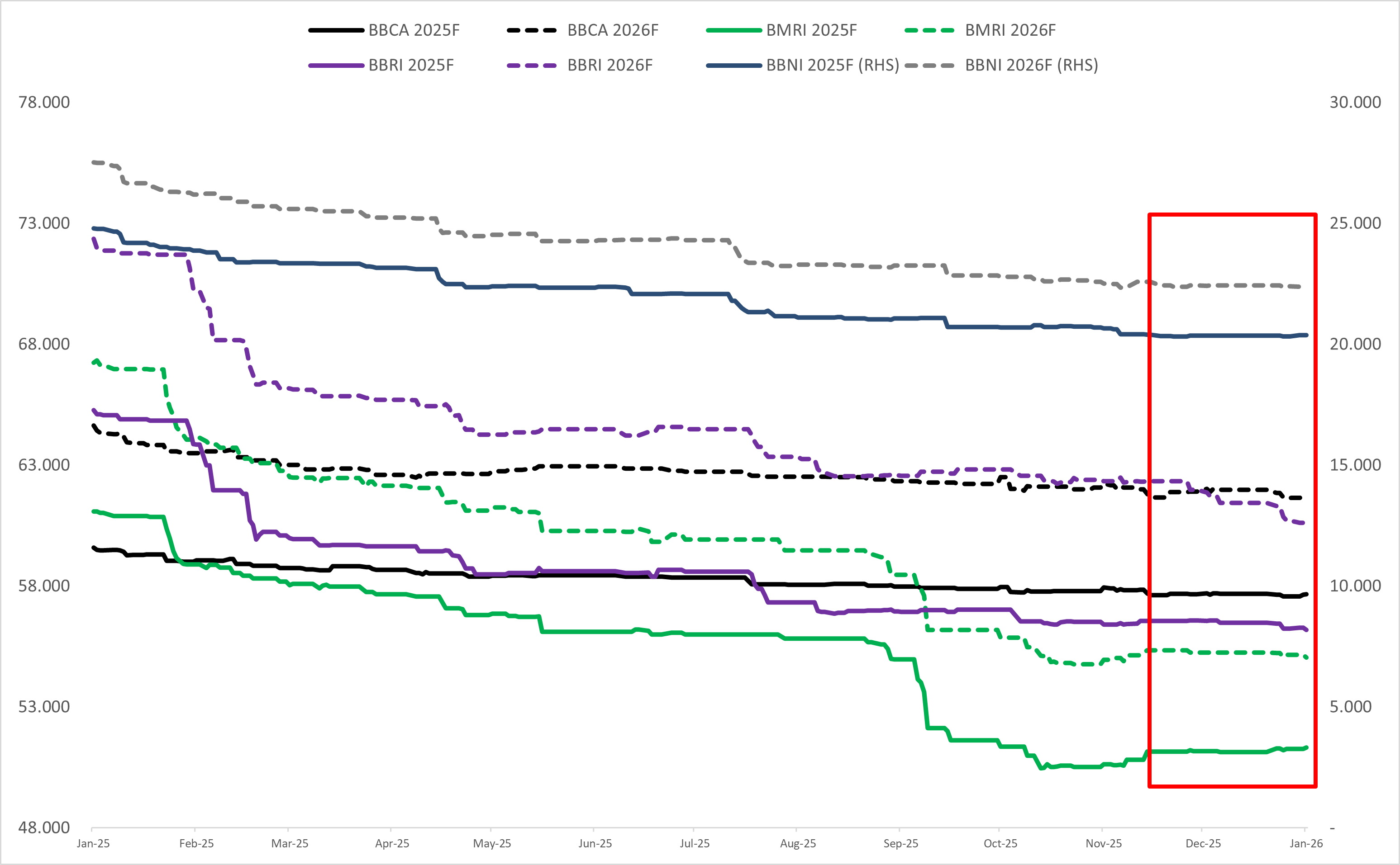 Siklus pemangkasan estimasi kinerja telah selesai — Sepanjang 2025, konsensus terus memangkas ekspektasi laba bersih Big 4 Banks seiring realisasi berjalan yang mengecewakan dan kondisi makro yang menantang. Namun, sejak November 2025, tren pemangkasan estimasi sudah melandai dan beberapa bank bahkan secara selektif mulai ditingkatkan estimasi labanya. Selain itu, ketidakpastian kebijakan pemerintah, terutama terkait penugasan Himbara pada program pemerintah — yang turut menimbulkan sentimen negatif — kami nilai juga sudah terefleksi pada harga saham. Perkembangan terakhir mengindikasikan keterlibatan Himbara yang terbatas pada program pemerintah, sehingga melimitasi dampak terhadap profitabilitas dan kapasitas permodalan Himbara.