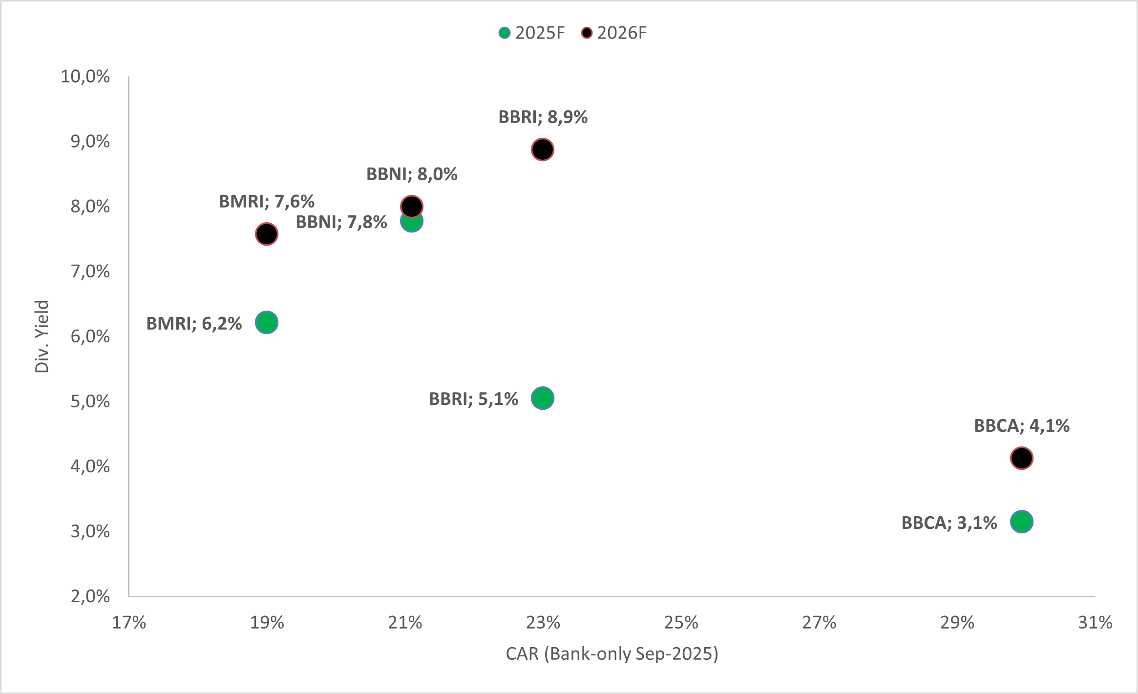 Dari aspek dividen, ketiga bank Himbara (BMRI, BBRI, dan BBNI) menawarkan potensi dividend yield yang tinggi. Berdasarkan estimasi konsensus, dividend yield dari tahun buku 2026F mencapai 8–9%. Sementara itu, untuk BBCA, estimasi dividend yield berada di level 4%. Dari tahun buku 2025, mengingat beberapa bank sudah membayar dividen interim, berikut estimasi dividend yield final masing–masing bank per 15 Januari 2026: