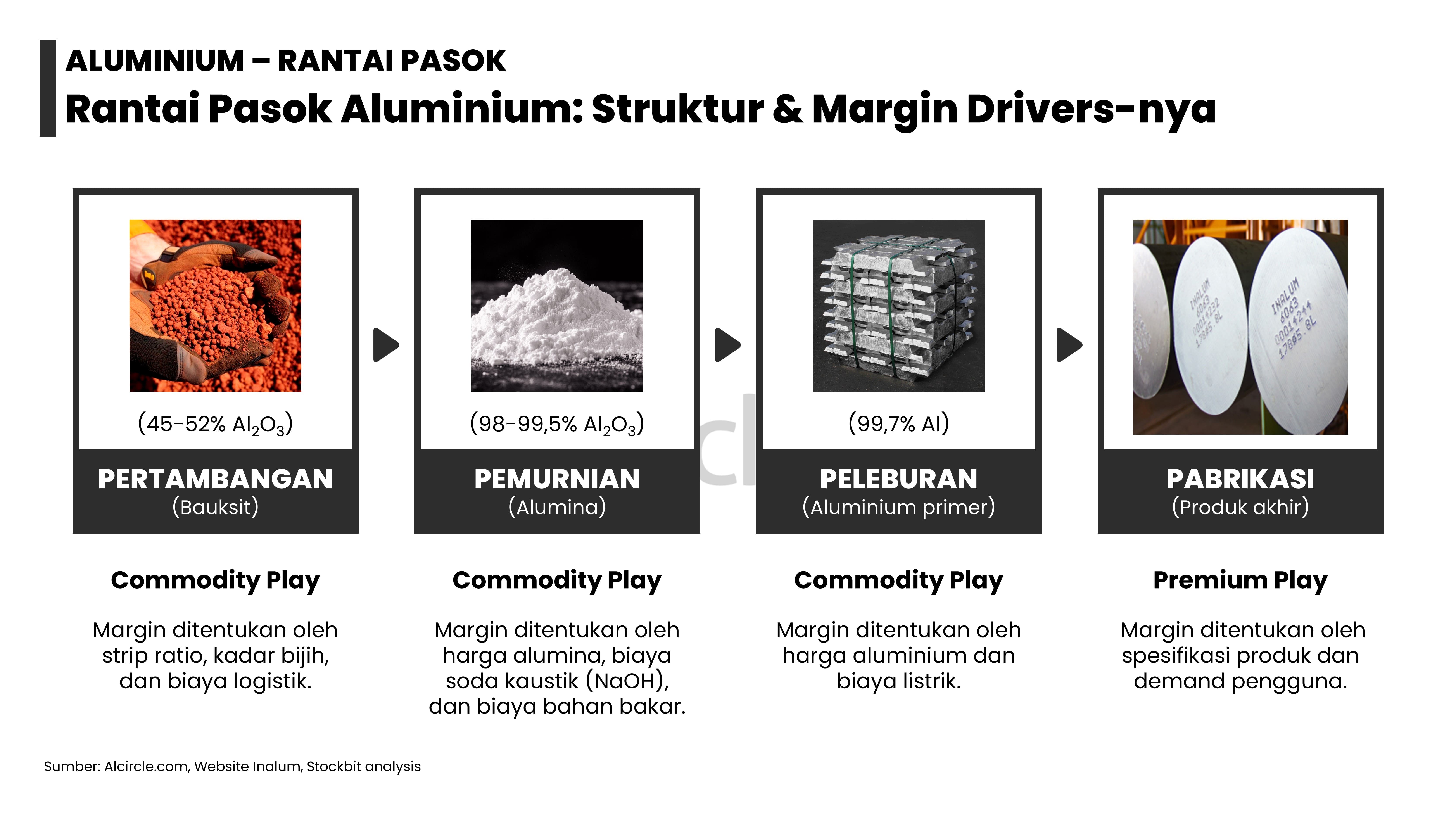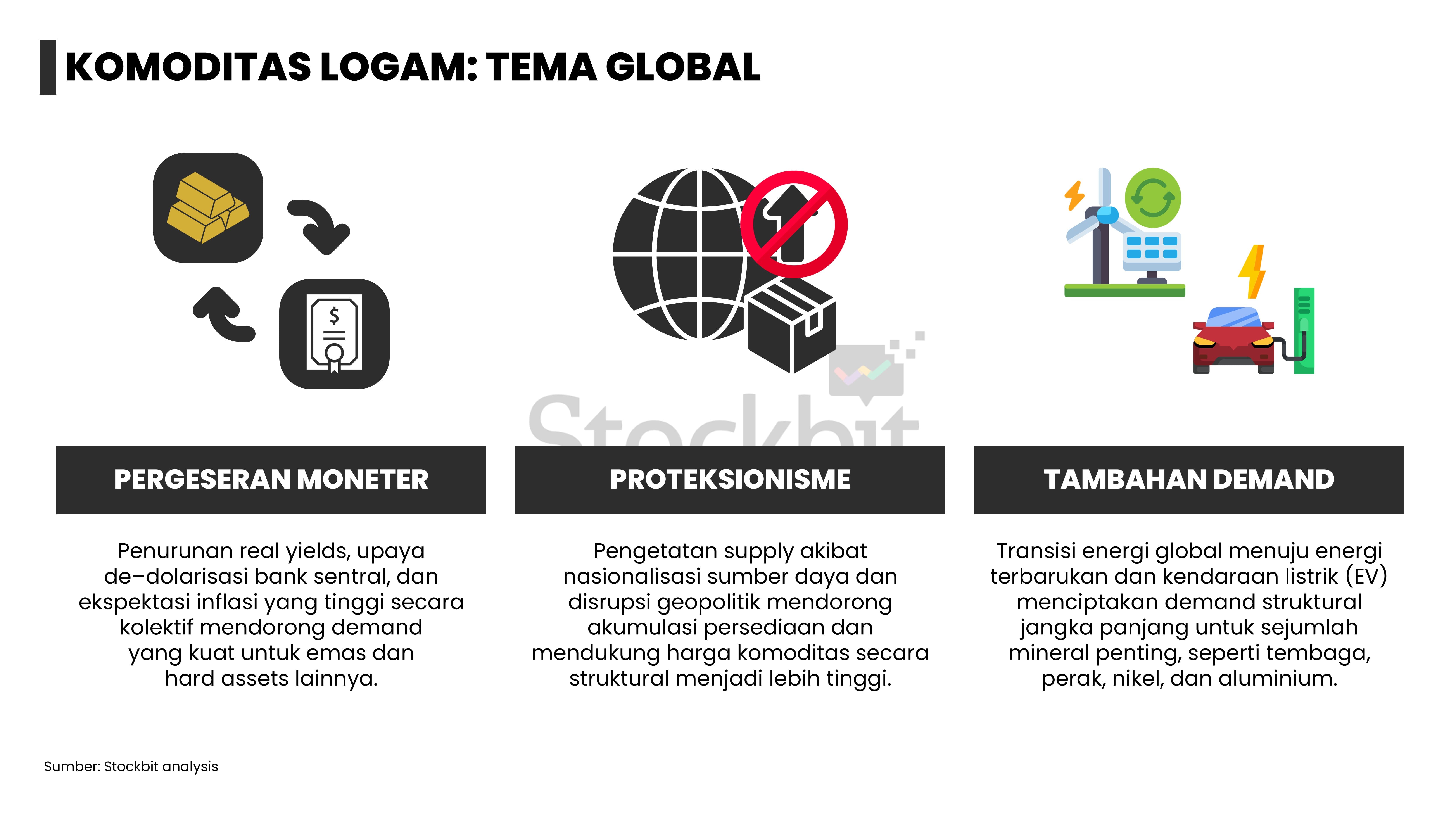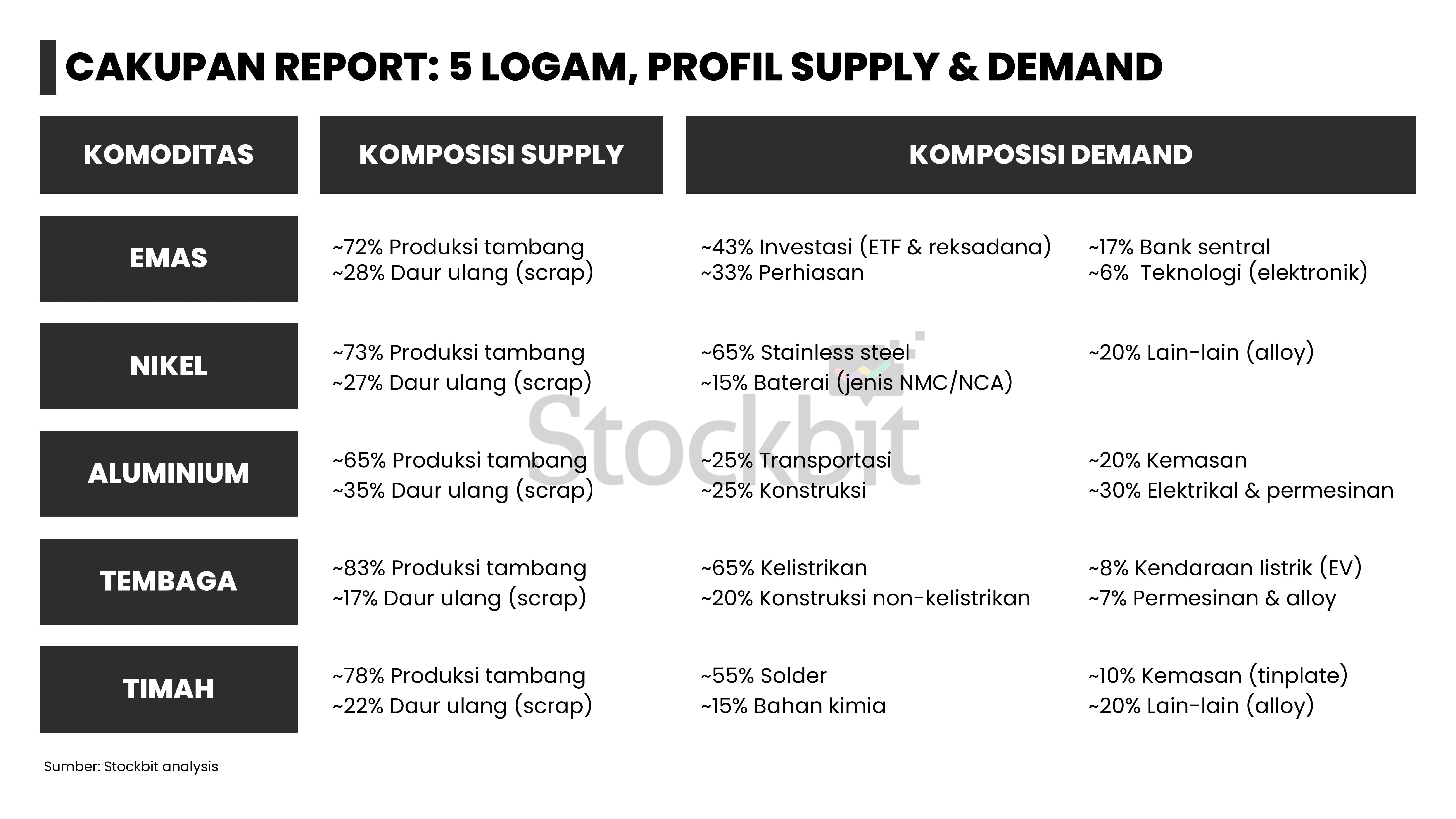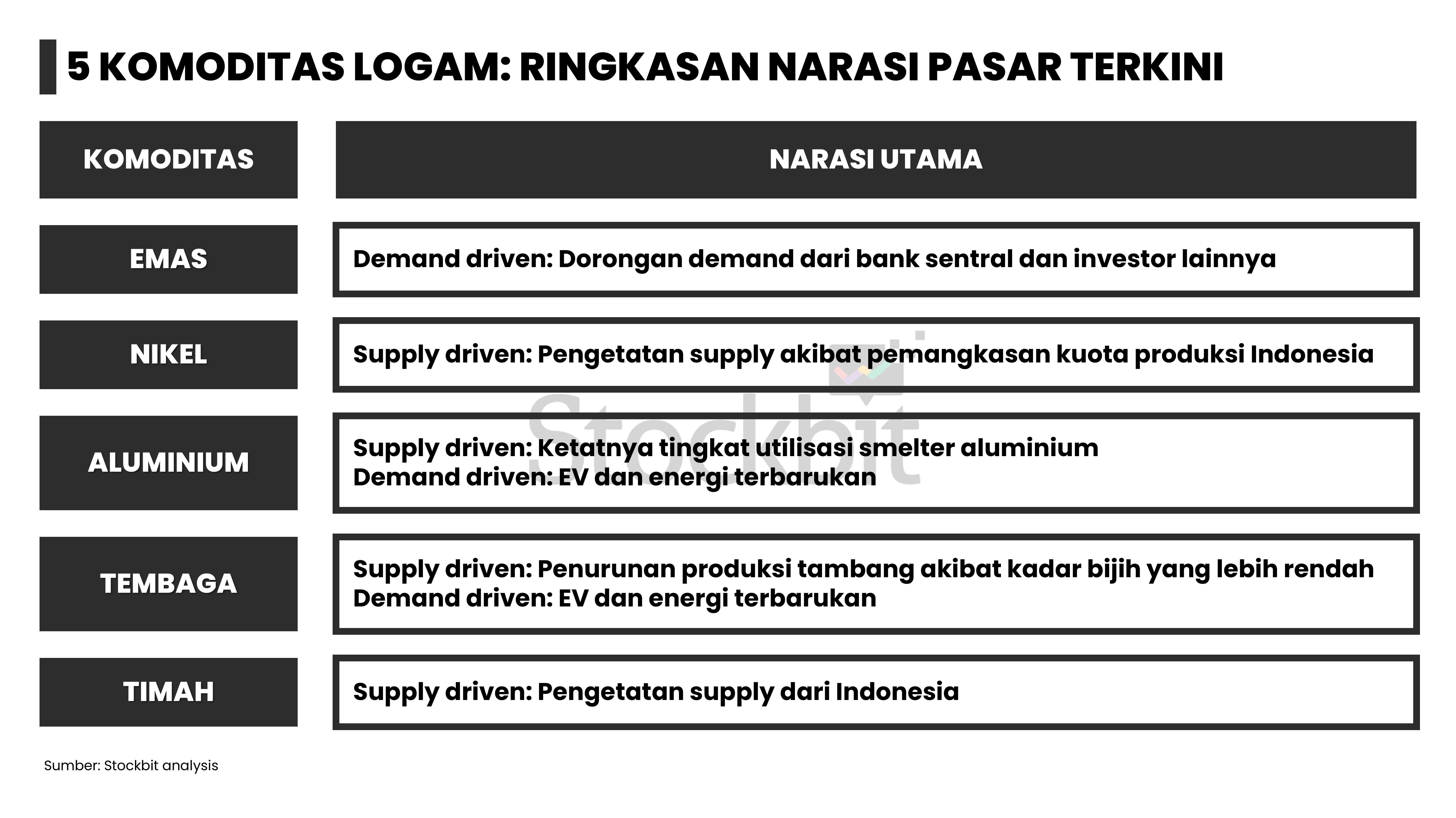 - Masing–masing logam memiliki dinamika supply–demand yang berbeda: 1) emas didorong permintaan dari bank sentral dan investor lain; 2) nikel didorong pengetatan pasokan dari Indonesia; 3) aluminium didorong pengetatan tingkat utilisasi smelter di tengah kenaikan permintaan dari EV dan EBT; 4) tembaga didorong penurunan produksi tambang di tengah kenaikan permintaan dari EV dan EBT; dan 5) timah didorong pengetatan pasokan dari Indonesia.