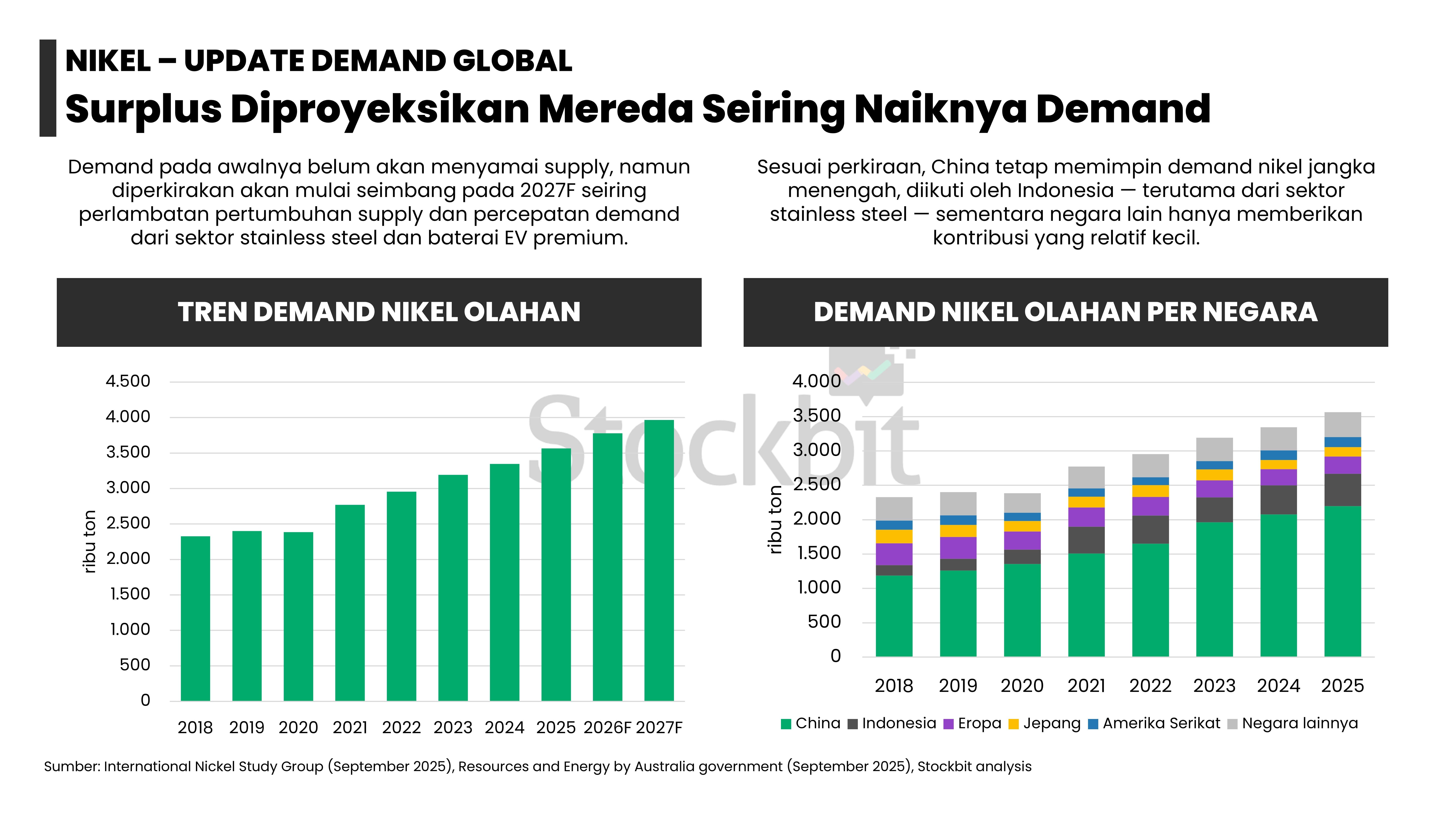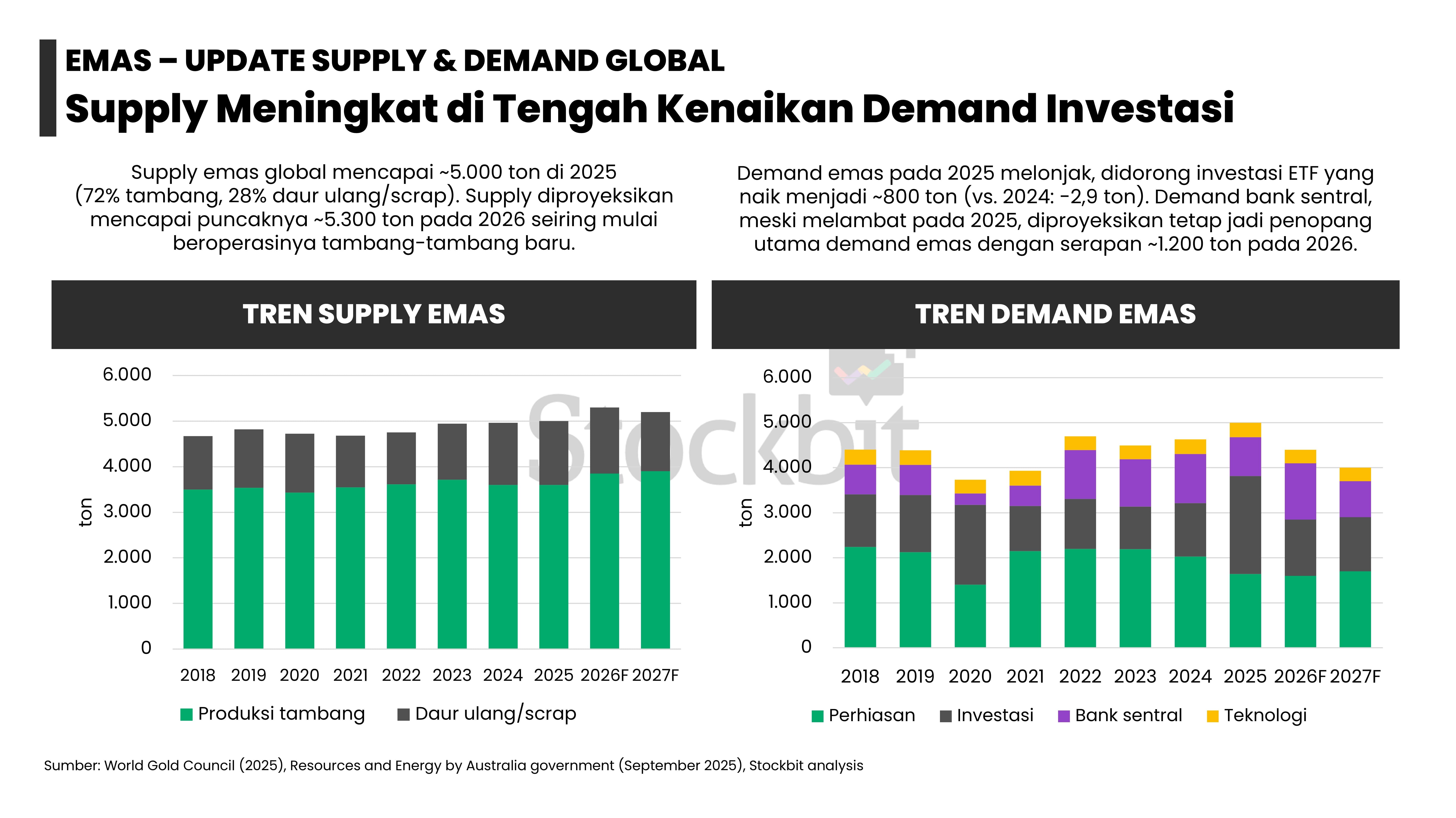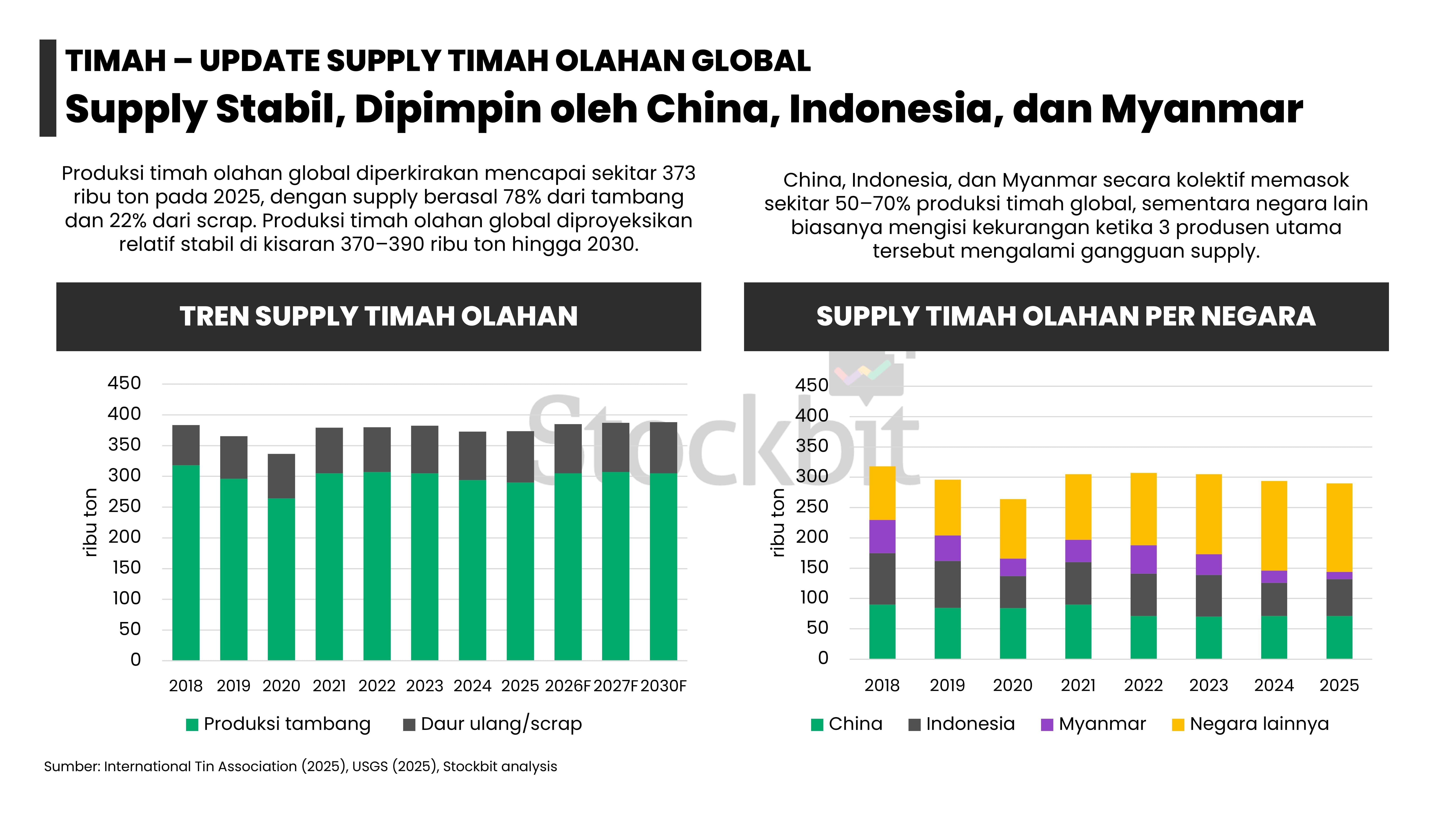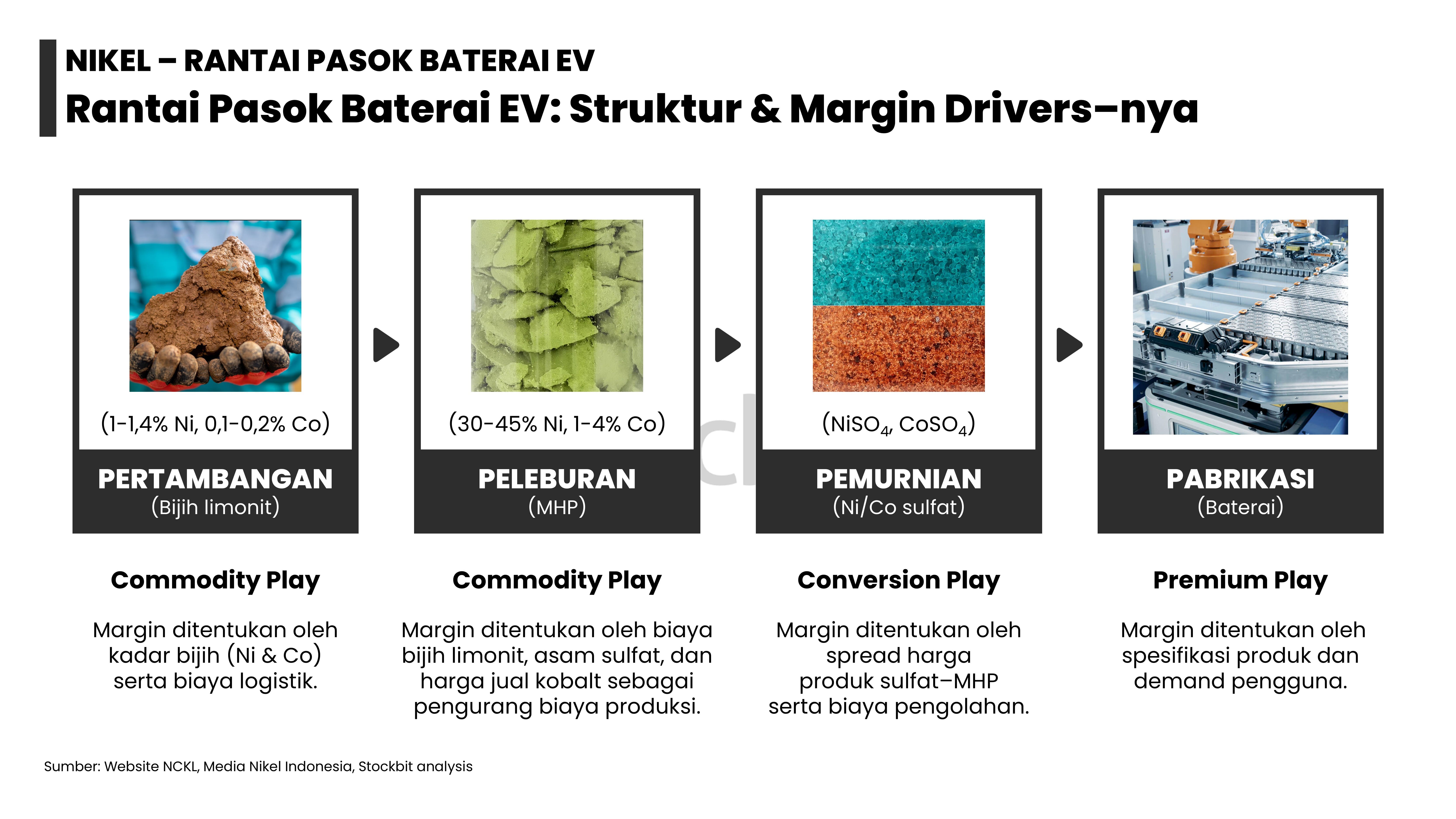 - Masing–masing logam memiliki dinamika supply–demand yang berbeda: 1) emas didorong permintaan dari bank sentral dan investor lain; 2) nikel didorong pengetatan pasokan dari Indonesia; 3) aluminium didorong pengetatan tingkat utilisasi smelter di tengah kenaikan permintaan dari EV dan EBT; 4) tembaga didorong penurunan produksi tambang di tengah kenaikan permintaan dari EV dan EBT; dan 5) timah didorong pengetatan pasokan dari Indonesia.