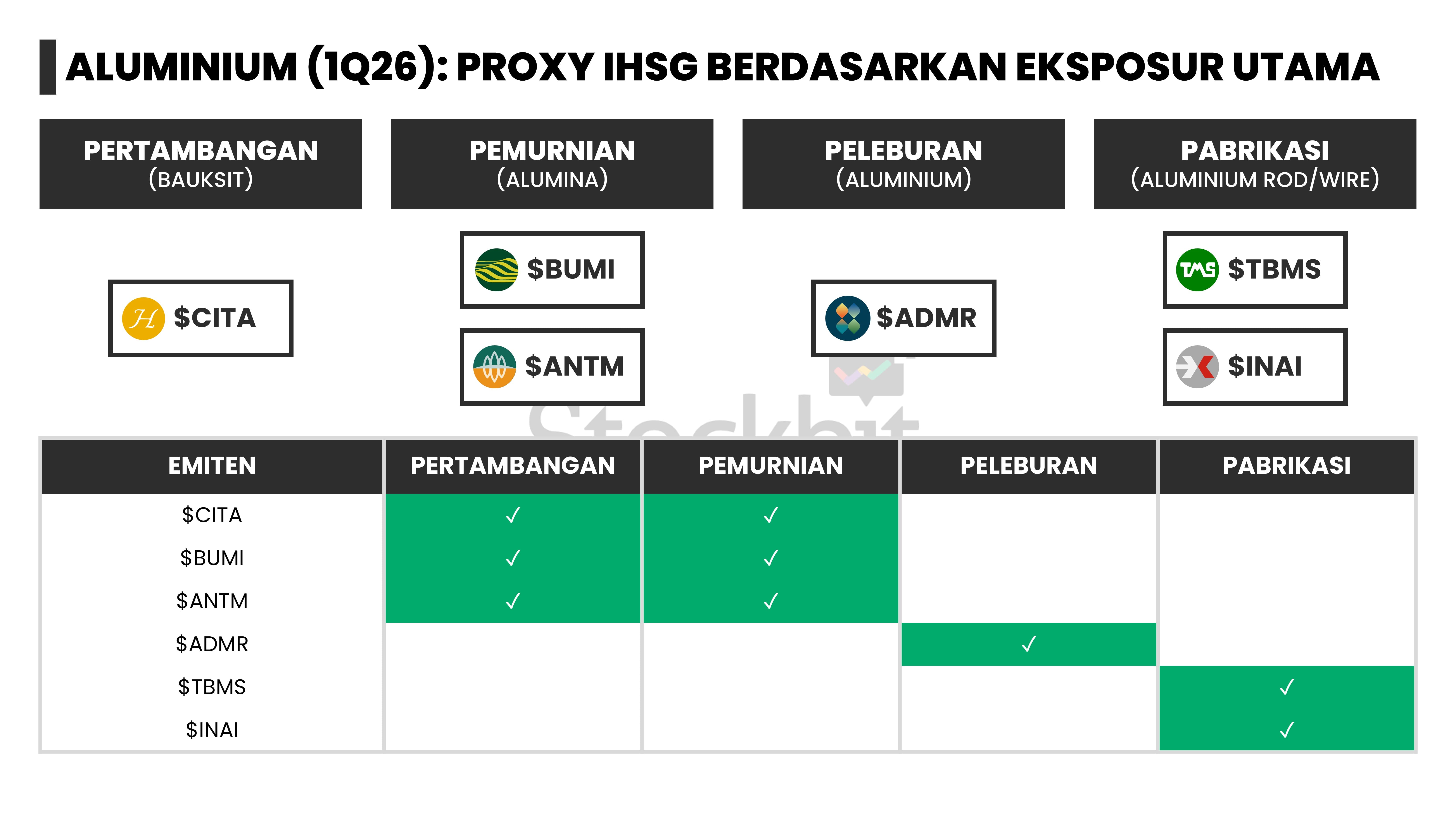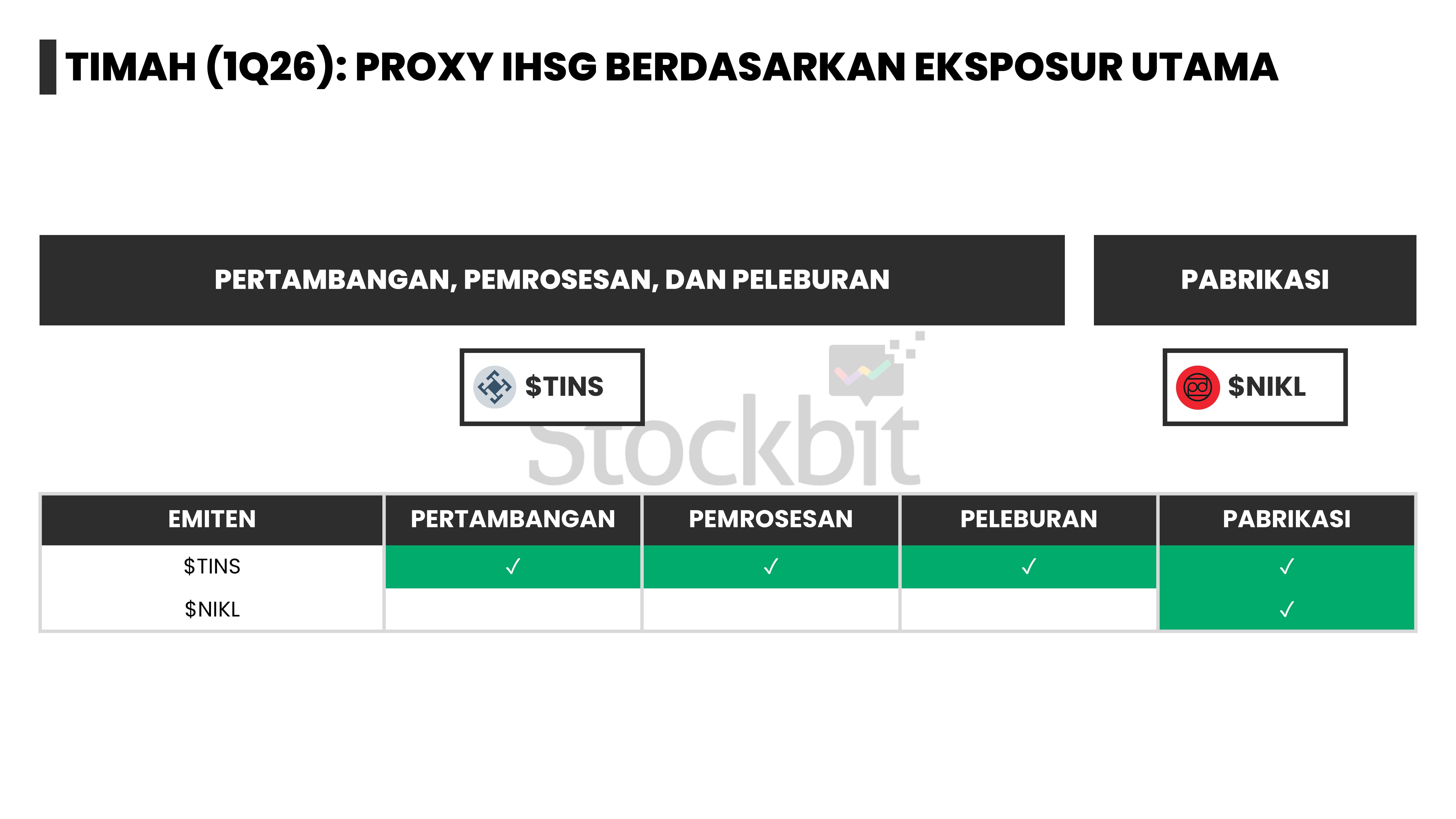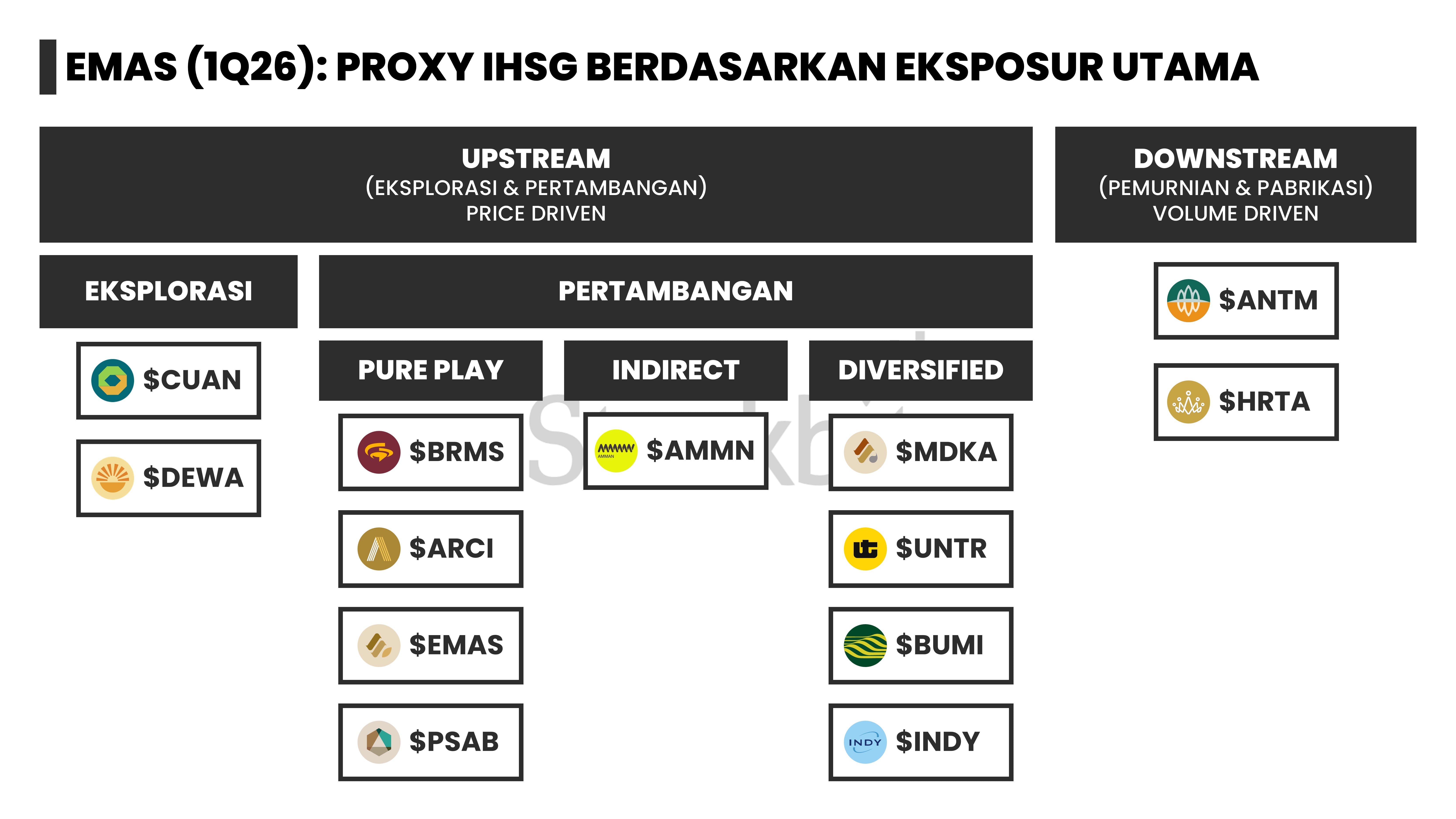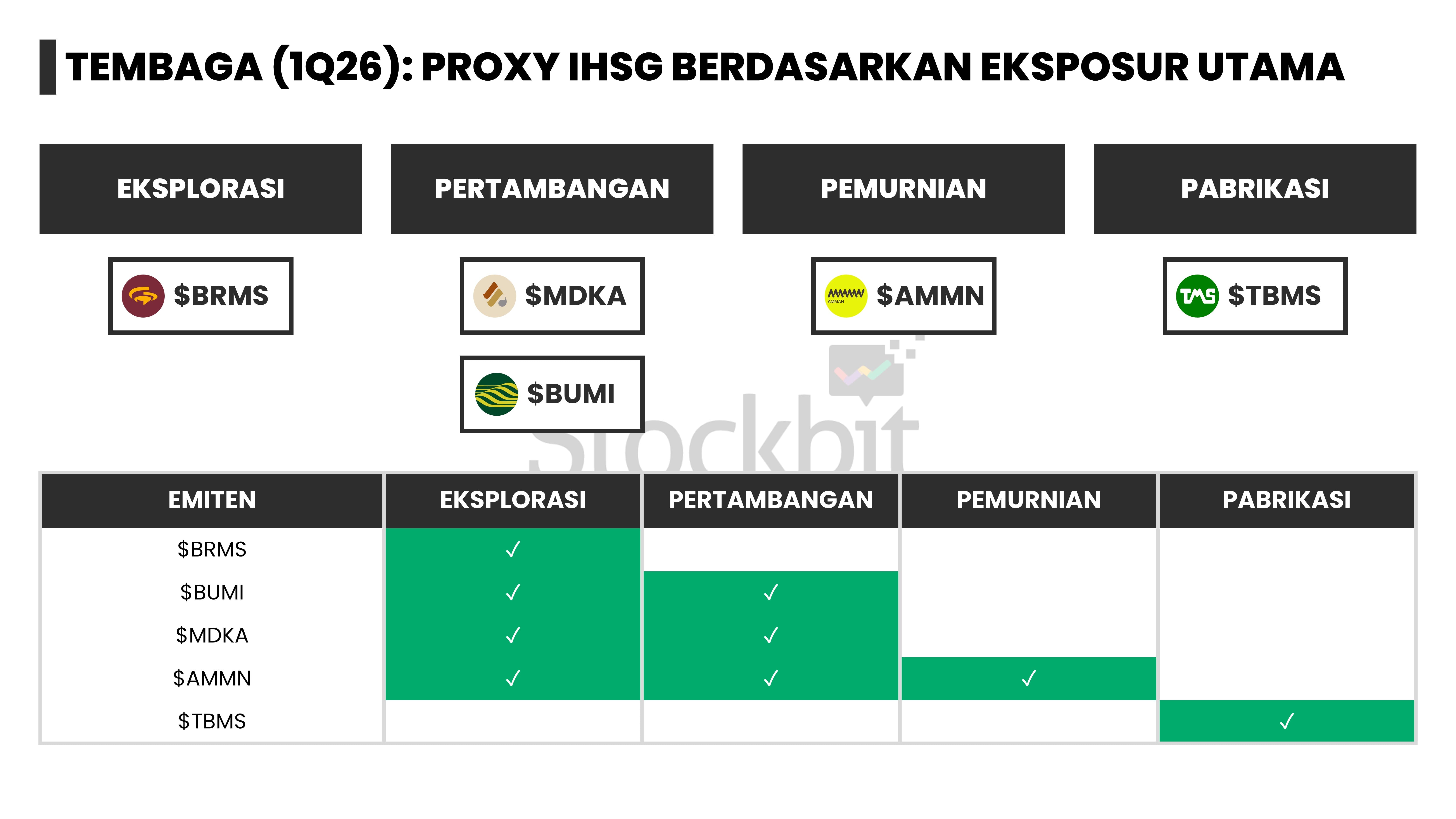 - Report ini juga akan membahas struktur bisnis dan margin drivers dari 27 emiten yang menjadi proxy komoditas kelima logam tersebut di IHSG, antara lain $EMAS, $ADMR, dan $TINS.