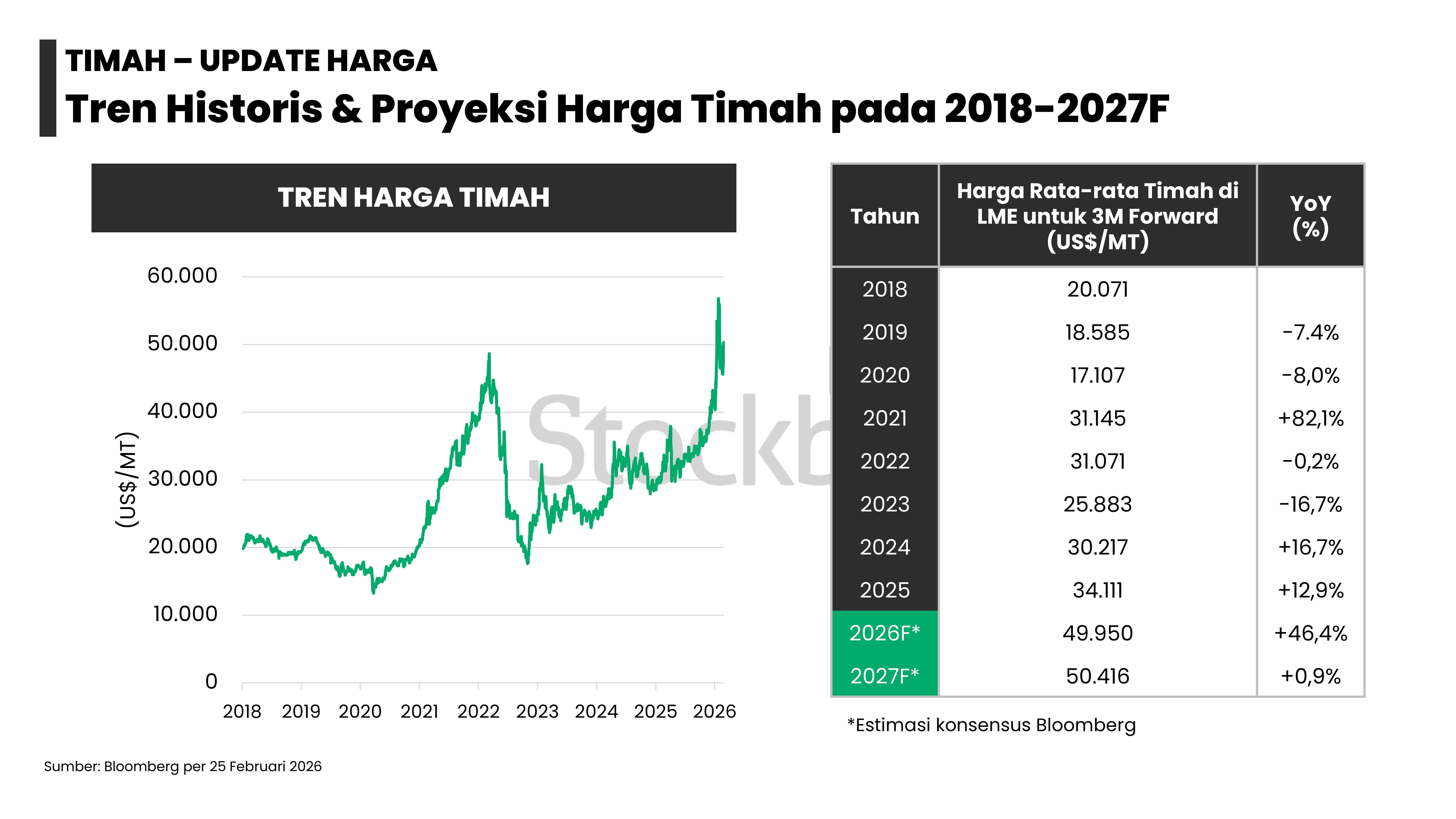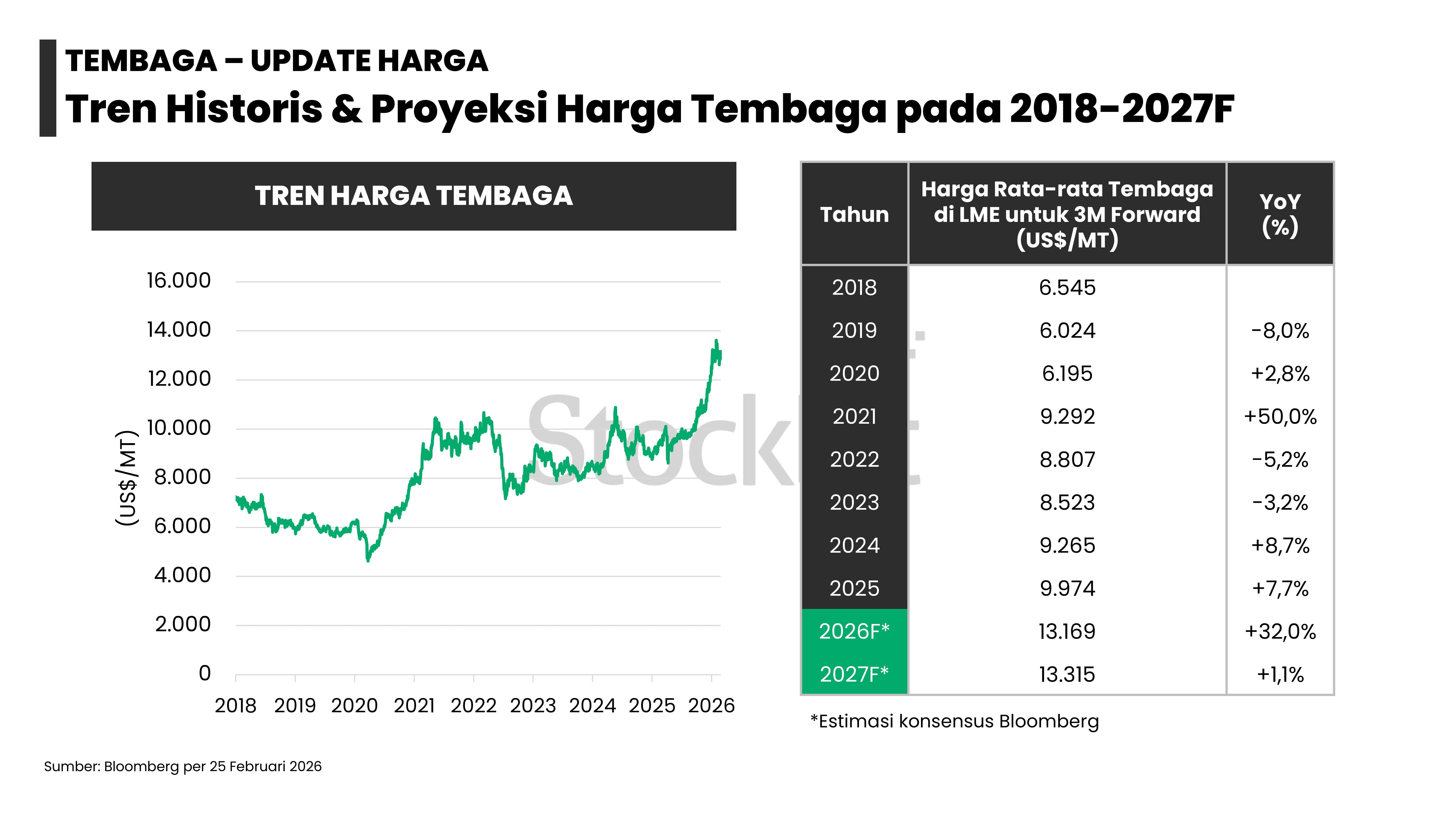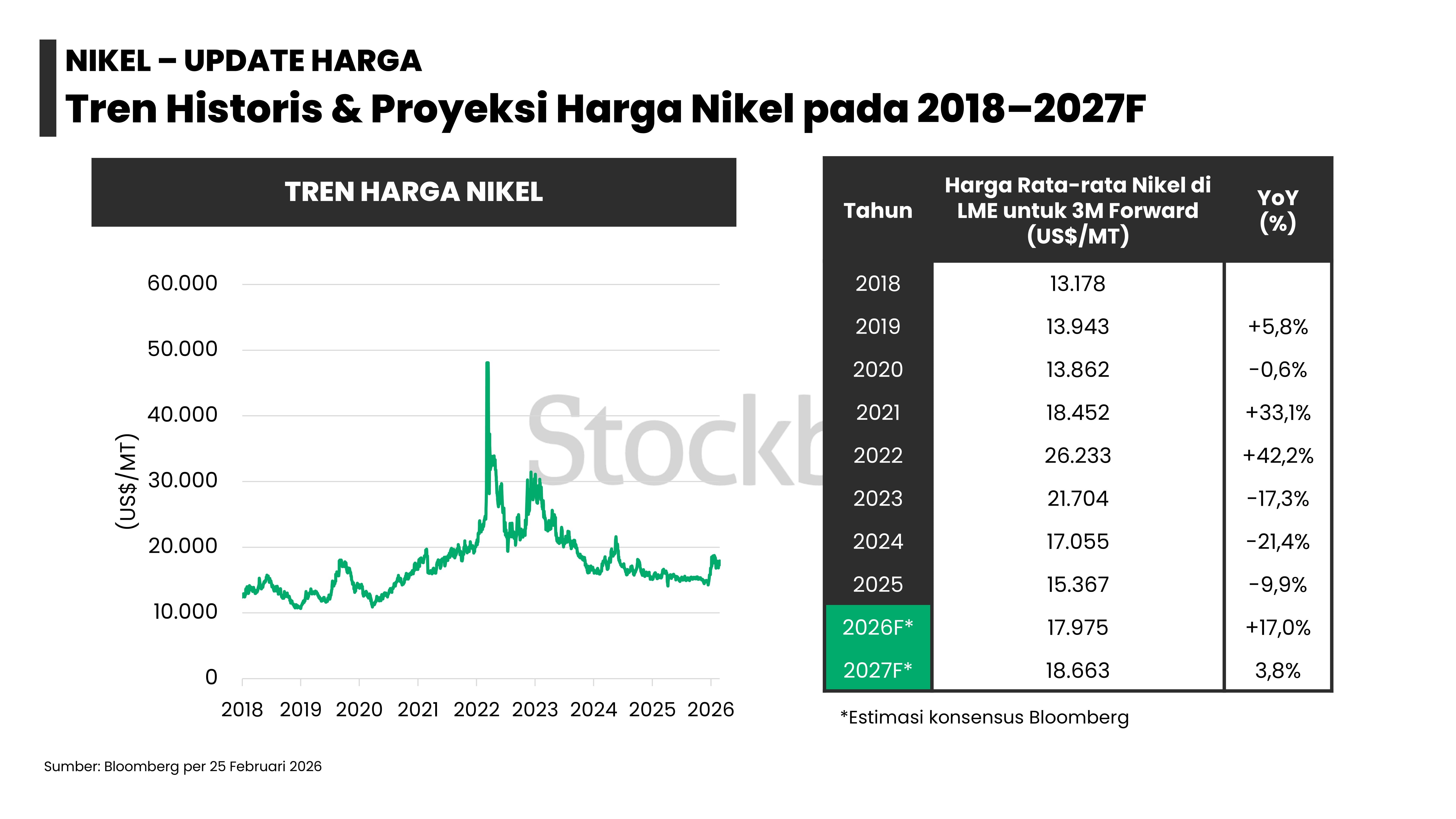 - Harga komoditas logam — seperti emas (+20%), nikel (+8%), aluminium (+6%), tembaga (+3%), dan timah (+24%) — telah melonjak sejak awal 2026 hingga 25 Februari 2026, didorong pergeseran kebijakan moneter, proteksionisme perdagangan, dan peningkatan permintaan.
